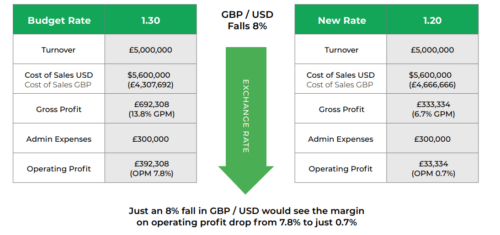 Below is an example of a UK company that buys its goods from Asia in USD. The business did not manage its currency risk. This table details the impact an 8% fall in the GBP/USD exchange rate had on their underlying profitability and sales.